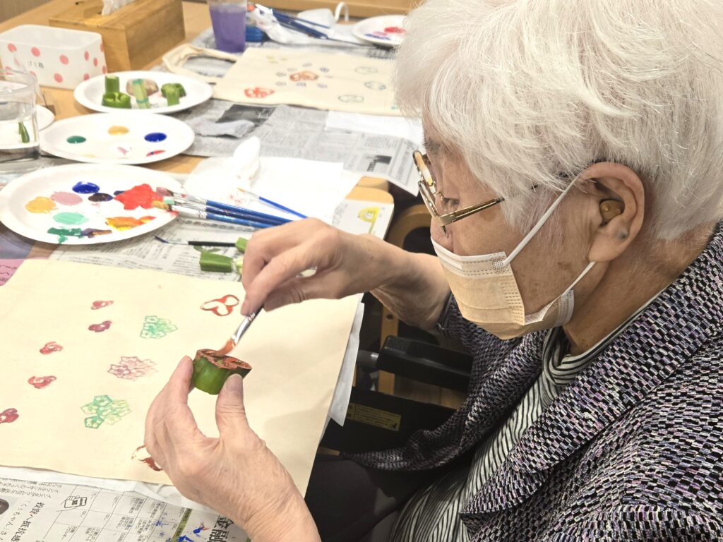 毎月恒例の園芸レク。今月は野菜の切り口のスタンプで、トートバッグを鮮やかに彩りました。