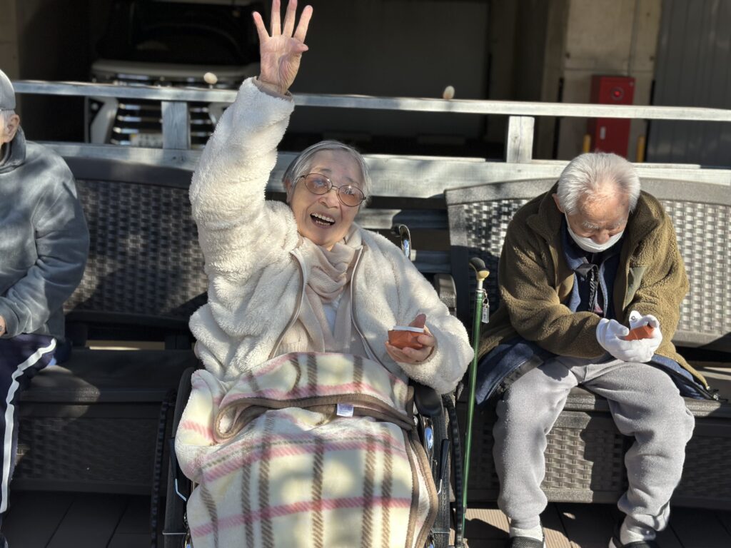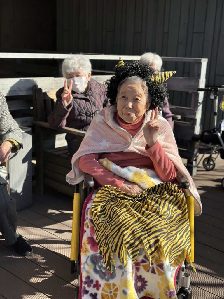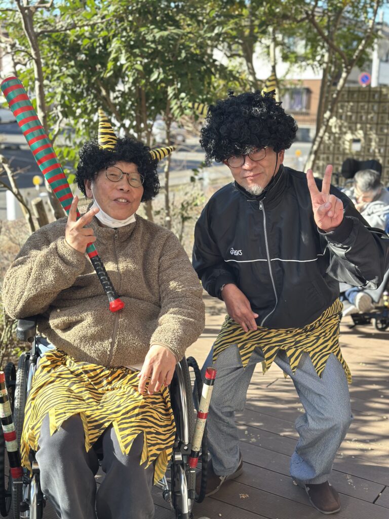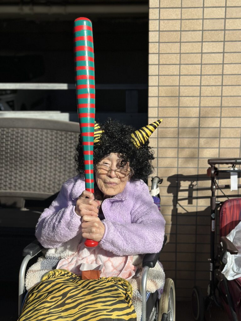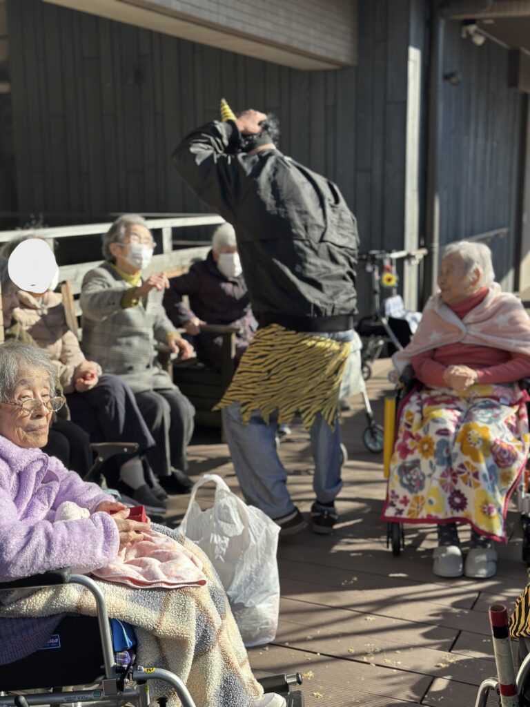 節分の今日、天候にも恵まれたため、テラスにて節分の豆まきを行いました。