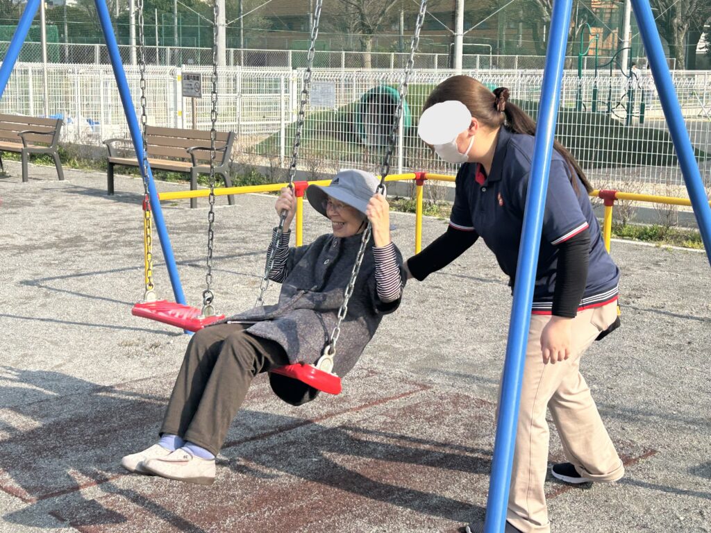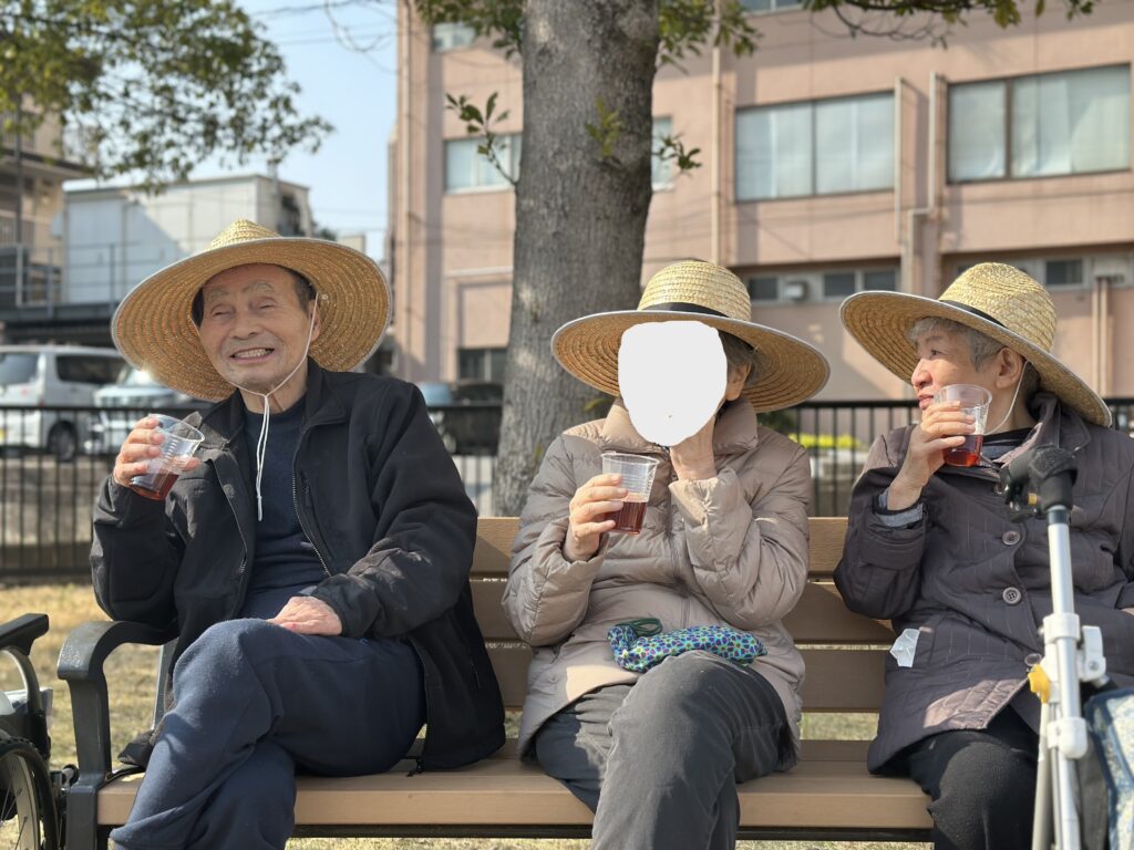 また、公園ではソメイヨシノがほのかに咲き始めており、春の気配を感じながら、数十年ぶりにブランコに乗られる方や、皆様でおやつを楽しまれるご様子も見られました。