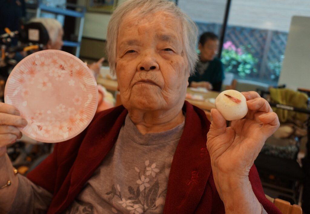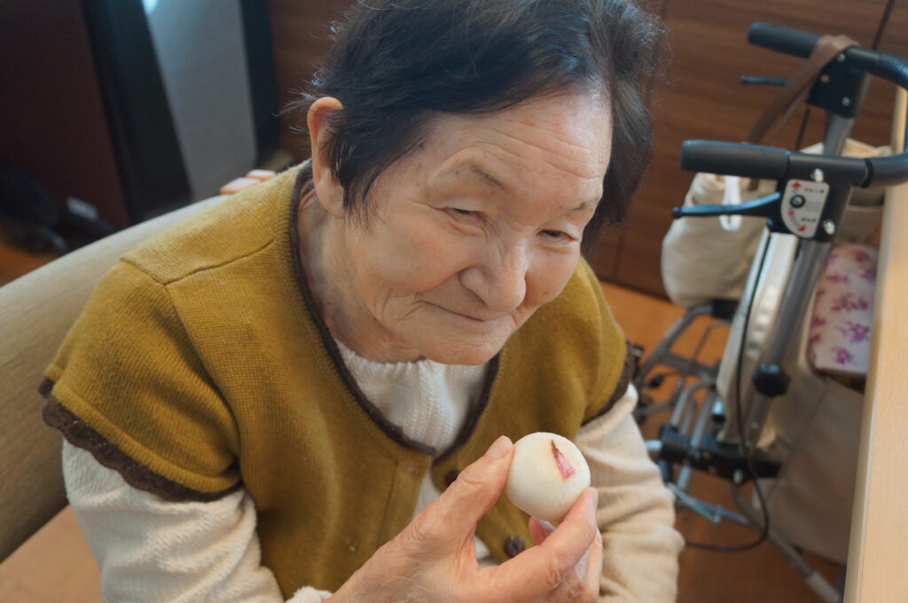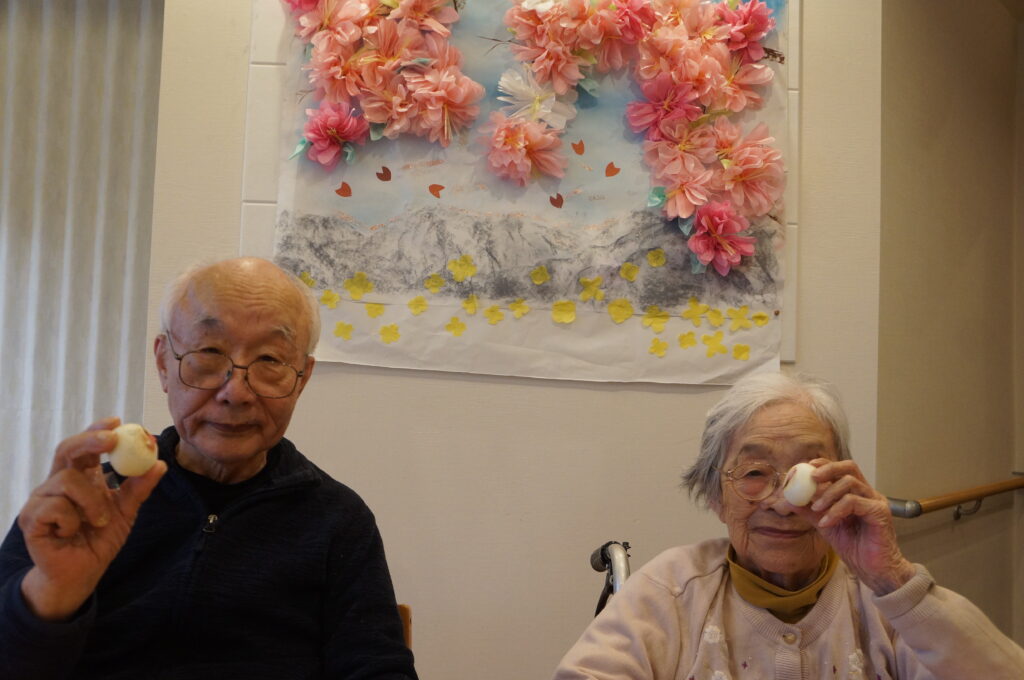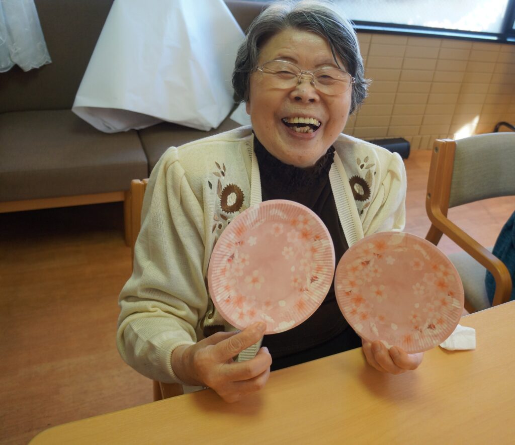 その代わりに施設内で桜の壁画レクの後に「さくら饅頭」と「さくら羊羹」を皆さんで召し上がっていただきました。