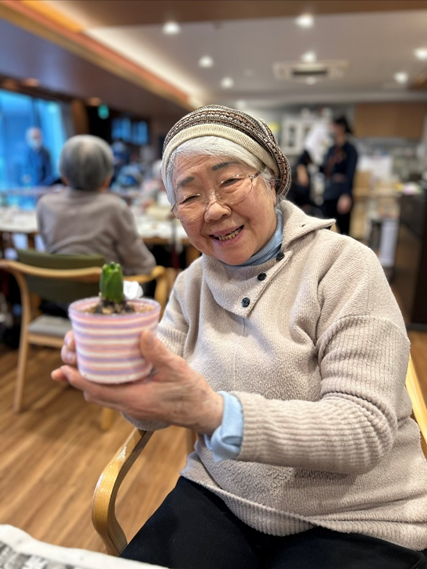 ヒヤシンスに水やりをして下さっているご利用者様の中には、普段から香りを感じることが難しい方もいらっしゃいます。