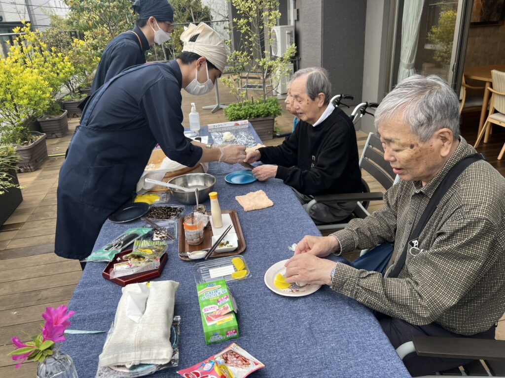 小腹が空く午後のひと時に2Fテラスを開放、青空の下皆さんでおにぎりを握りました🌼