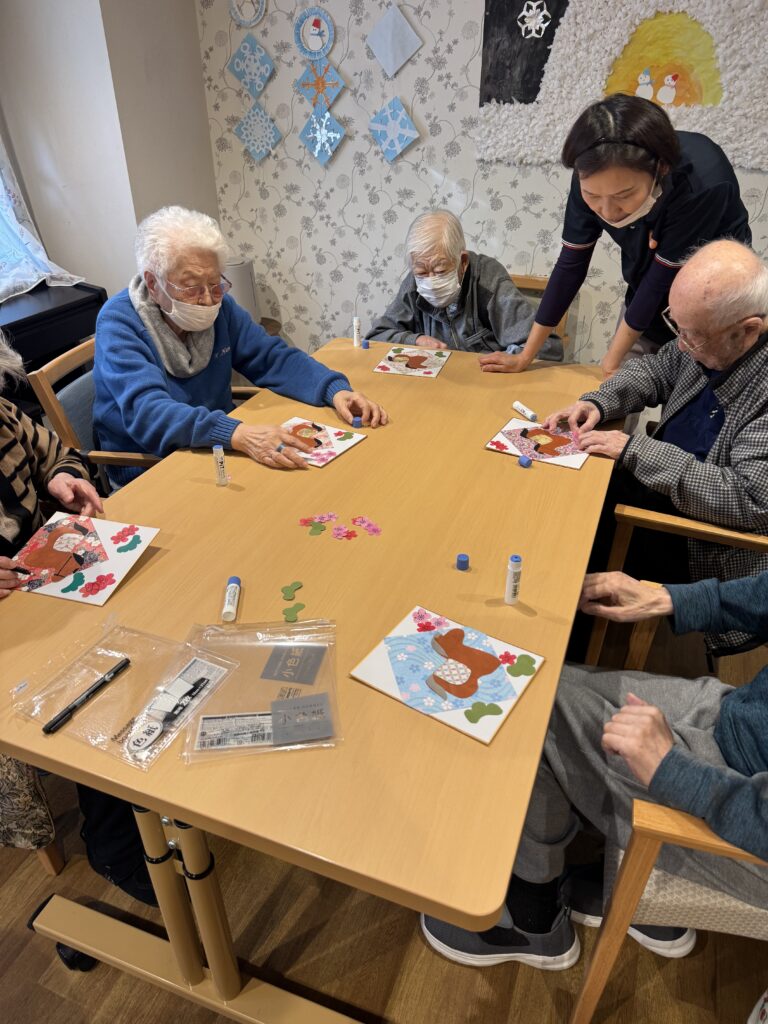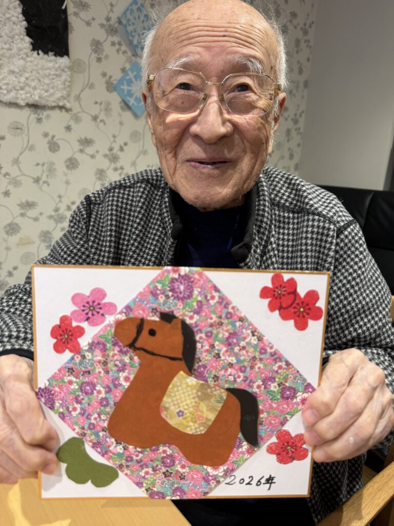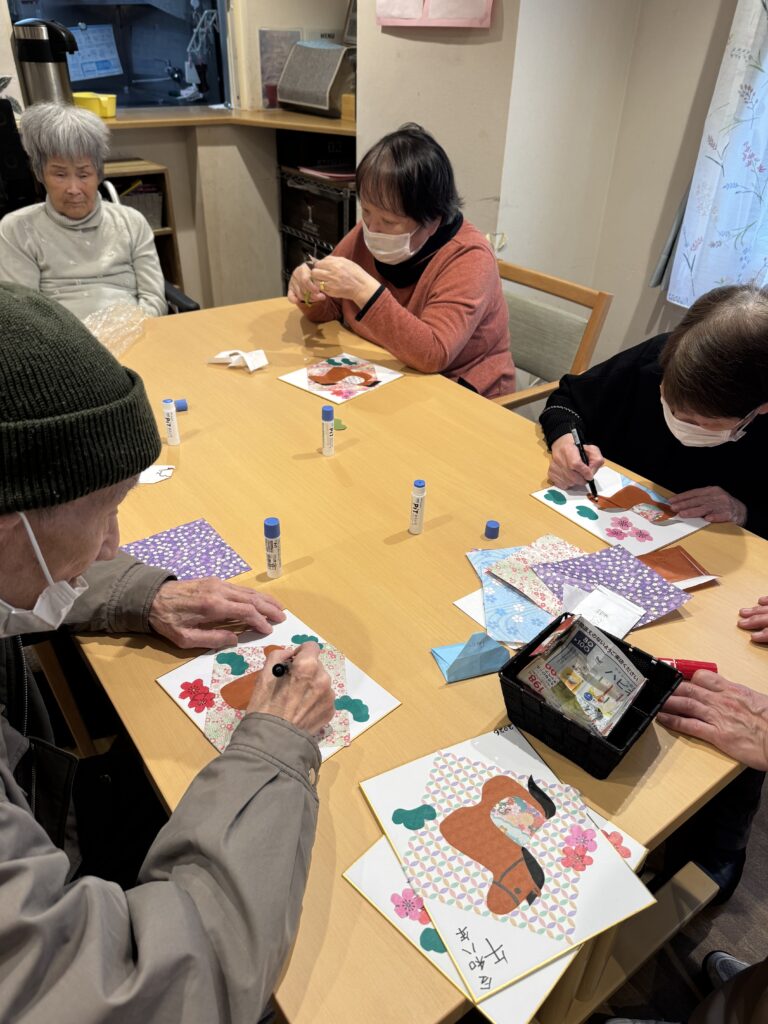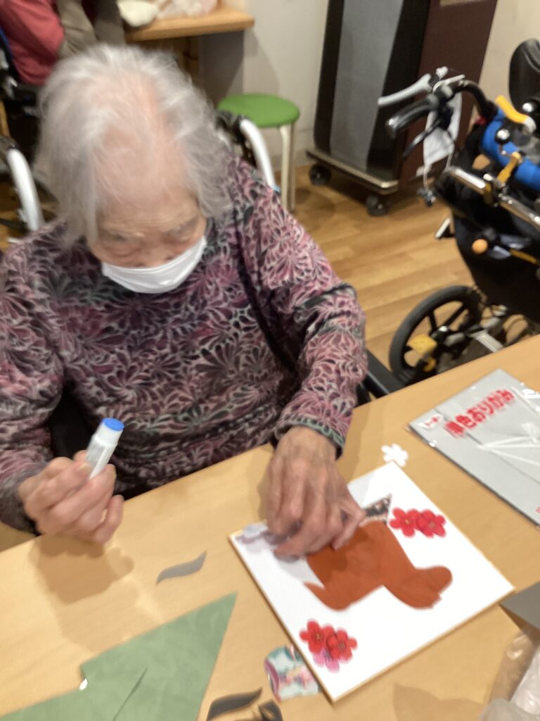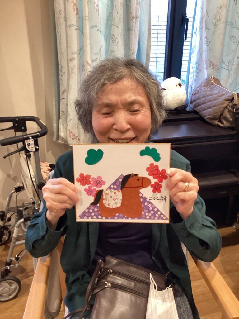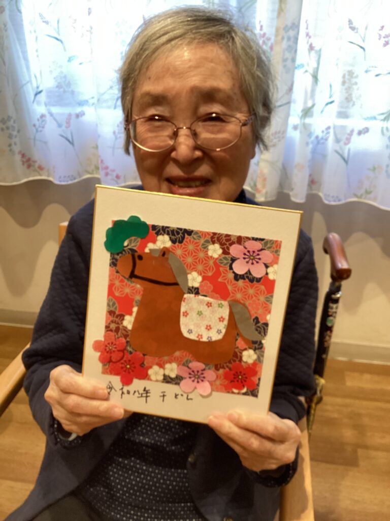 今年は『午』との事で、色紙に折紙などでパズルの様に組み合わせていき、まわりの飾りは自由に飾って頂きました!!