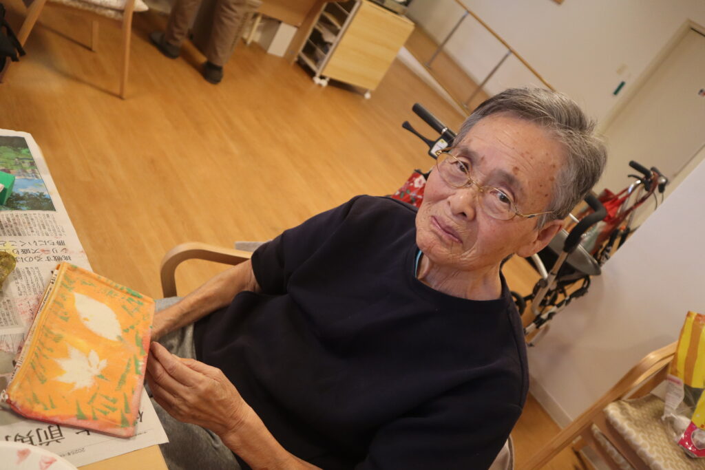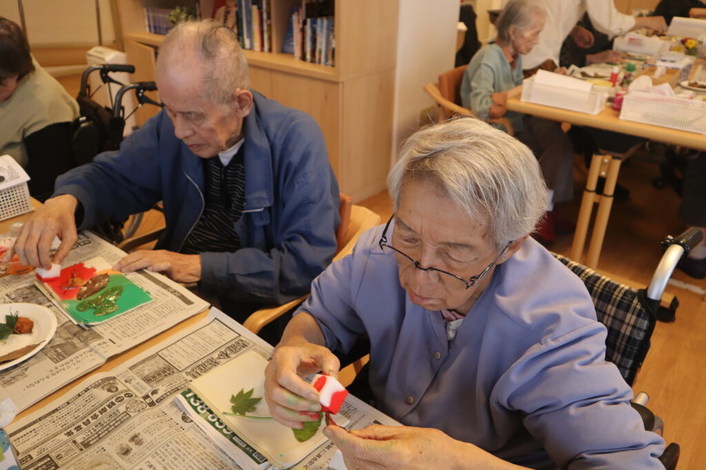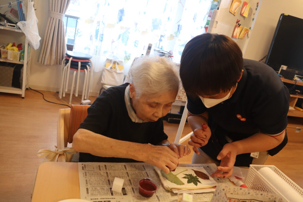 ポーチに落ち葉を貼り付けて好きな色の絵の具を塗ります。