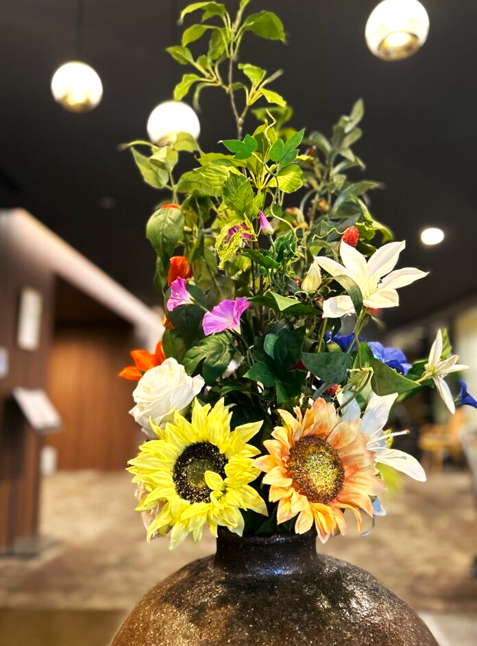 まずはこちら。エントランスから入って一番に目を引くのは、色とりどりのお花。