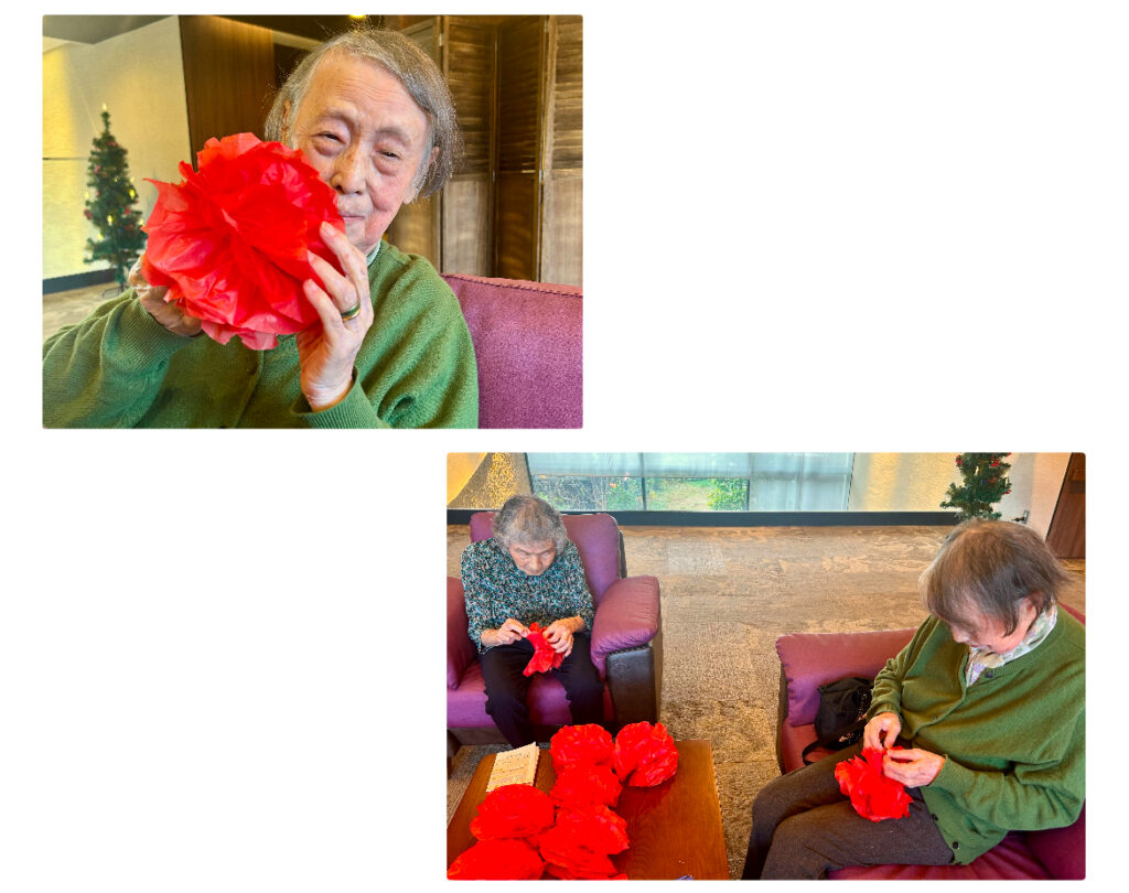 花飾りをつくる中で「この花、牡丹に似てて可愛いわね」「昔よく作ったのよ」などと会話も弾みます。