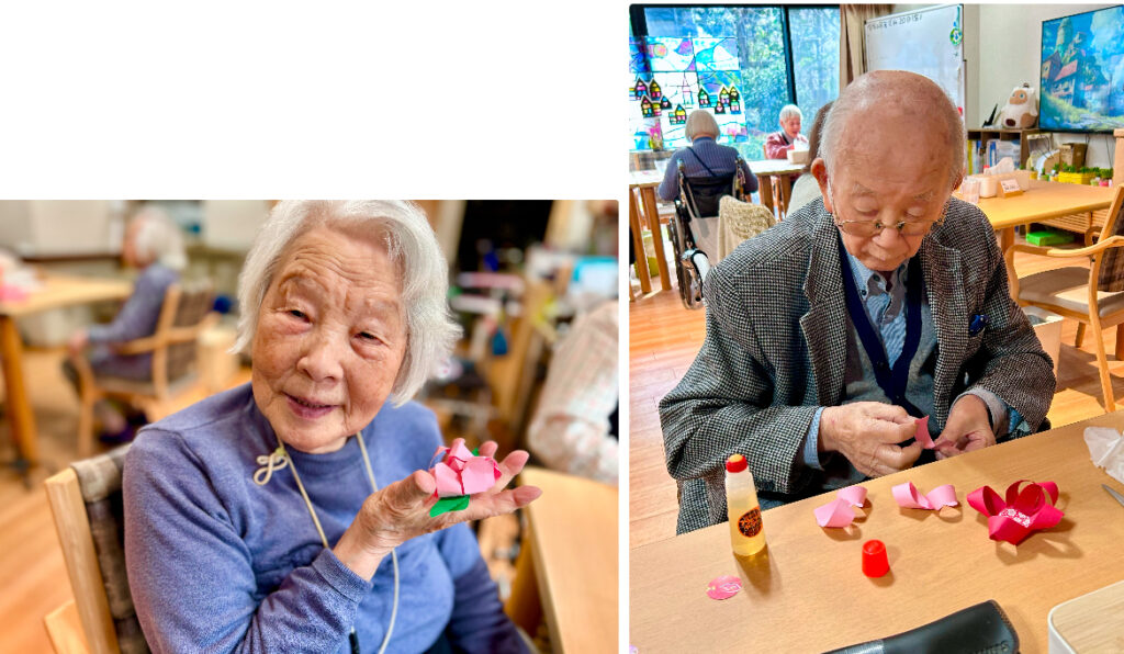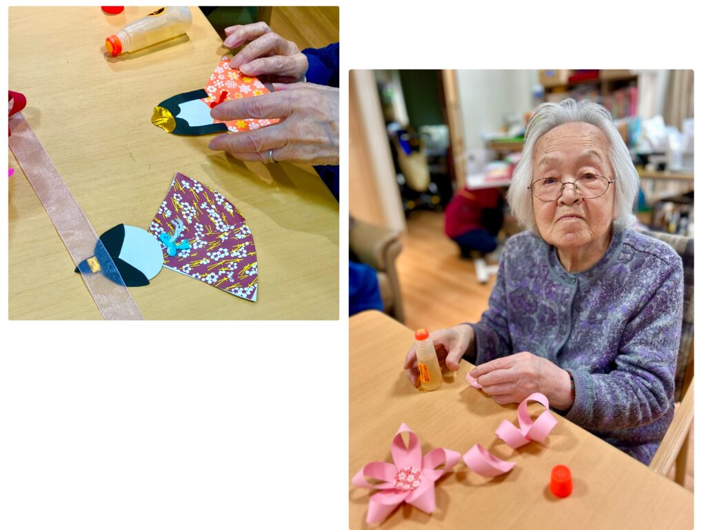 今年はひなまつりに向けて、お客様にもご協力いただき、桃の花など季節の飾りを制作いたしました。慣れない作業に苦戦される場面もございましたが、作品が完成した際には、皆様達成感に満ちた素敵な表情をしていらっしゃいました。