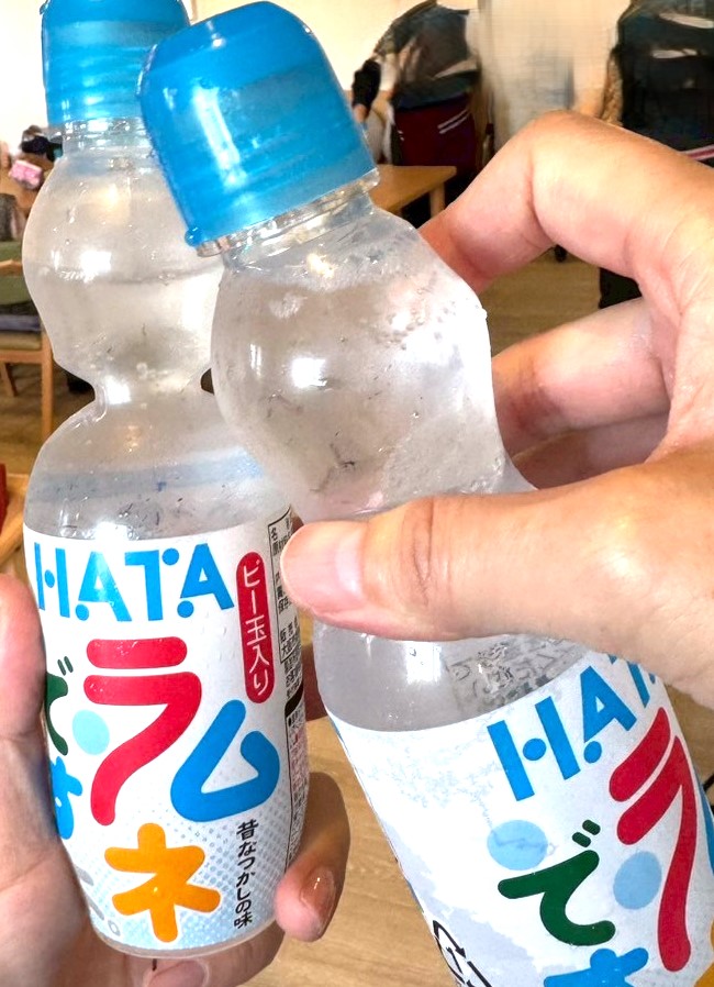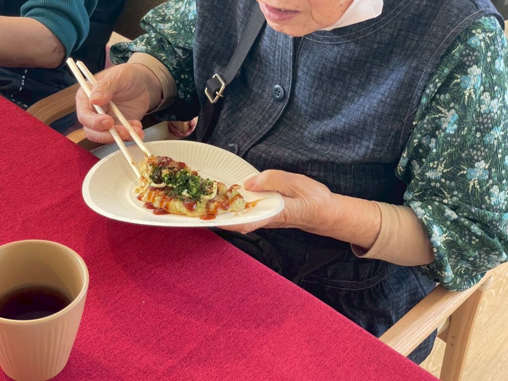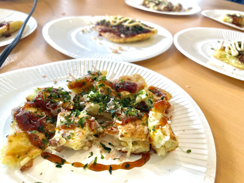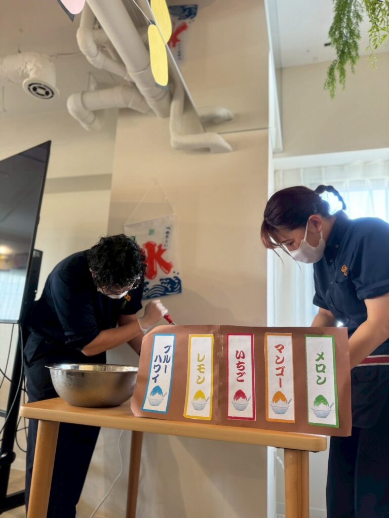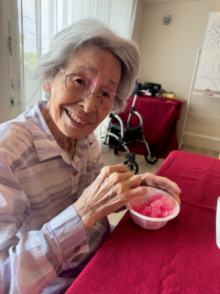 屋台のように並んだお好み焼きやかき氷、そしてラムネ。どれも大好評で、特にお好み焼きは「美味しい!」「おかわりする!」と、何枚もお召し上がりいただきました。かき氷も、各自でお好きな味を選んでいただき、涼しさと甘さを存分に楽しんでいただきました。