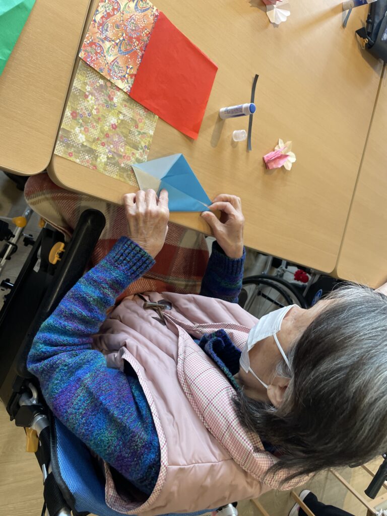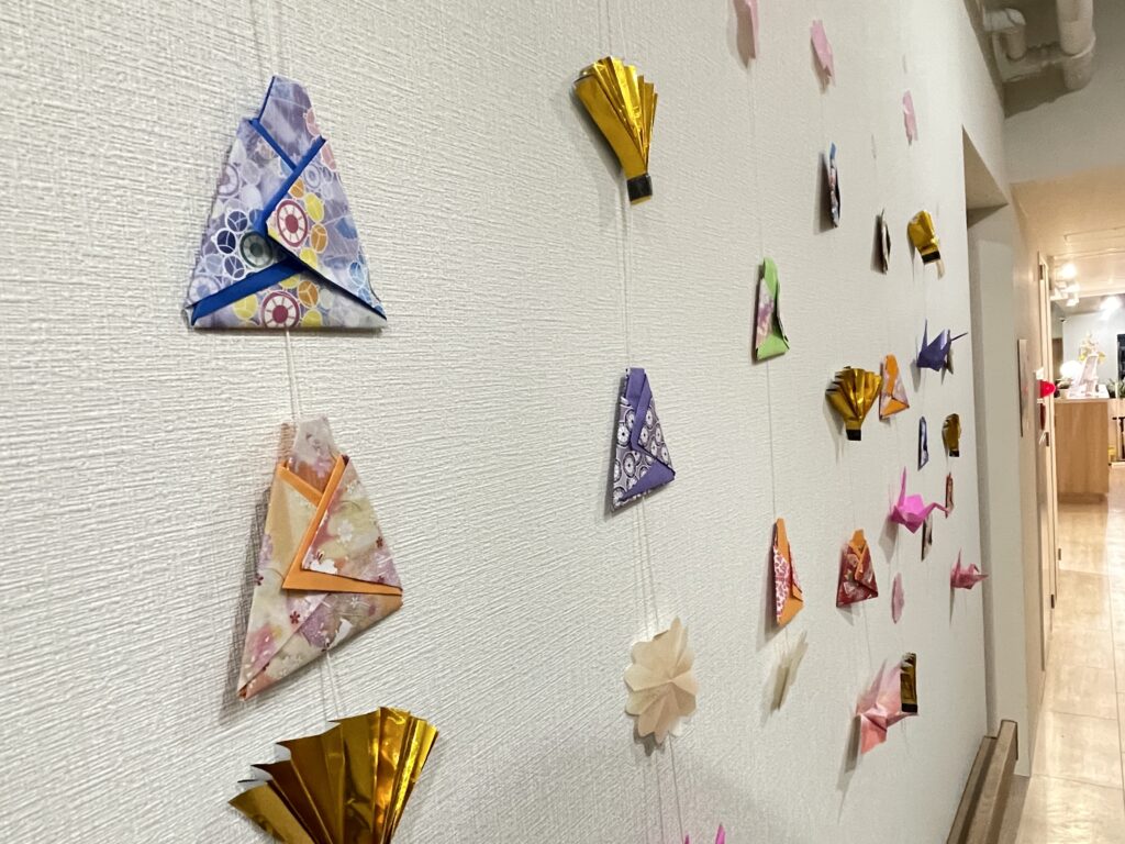 色とりどりの折り紙を使い、鶴やかわいらしい飾りを作成。完成した作品を壁に飾ると、施設内が一気に華やかで春らしい雰囲気になりました。